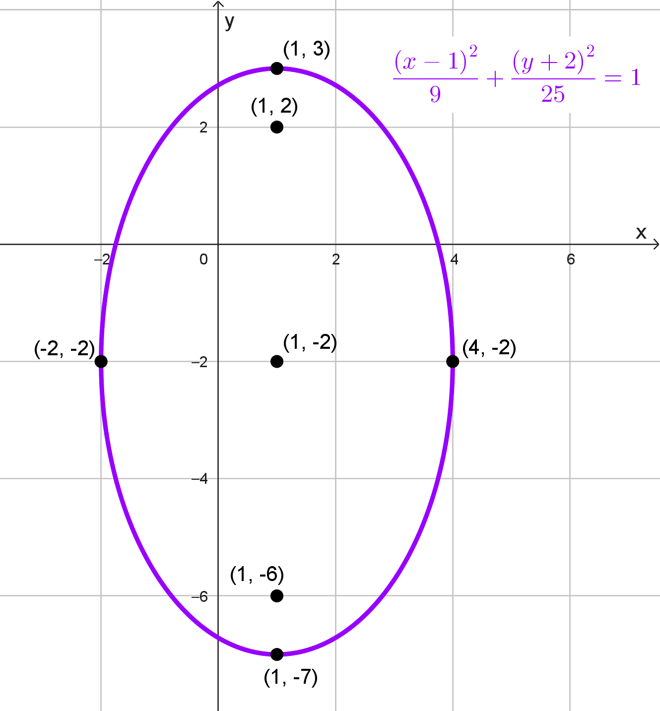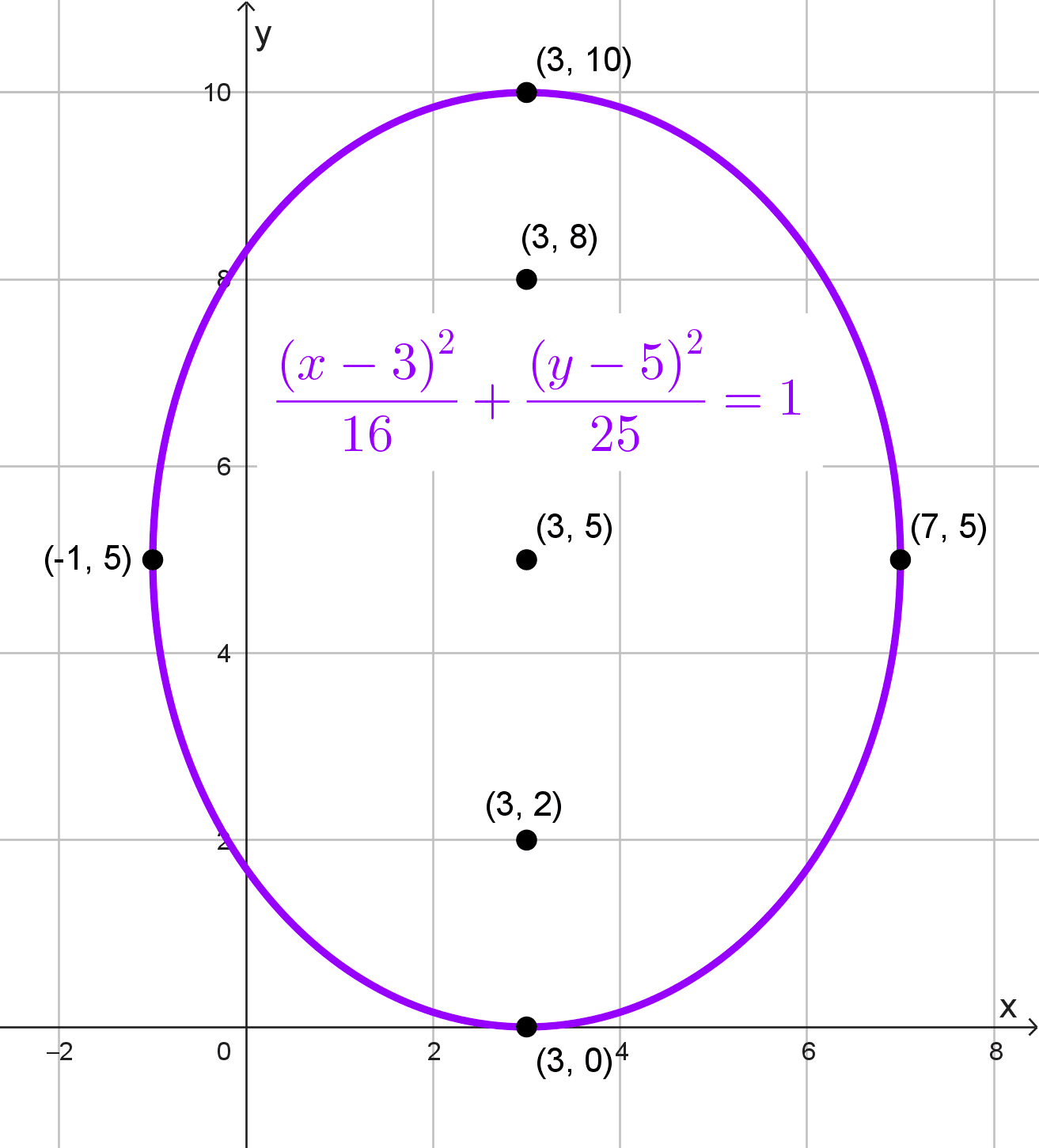 \(\text{Centro}=\left(\dfrac{2+2}{2},\dfrac{3+7}{2}\right)=(2,5)\)