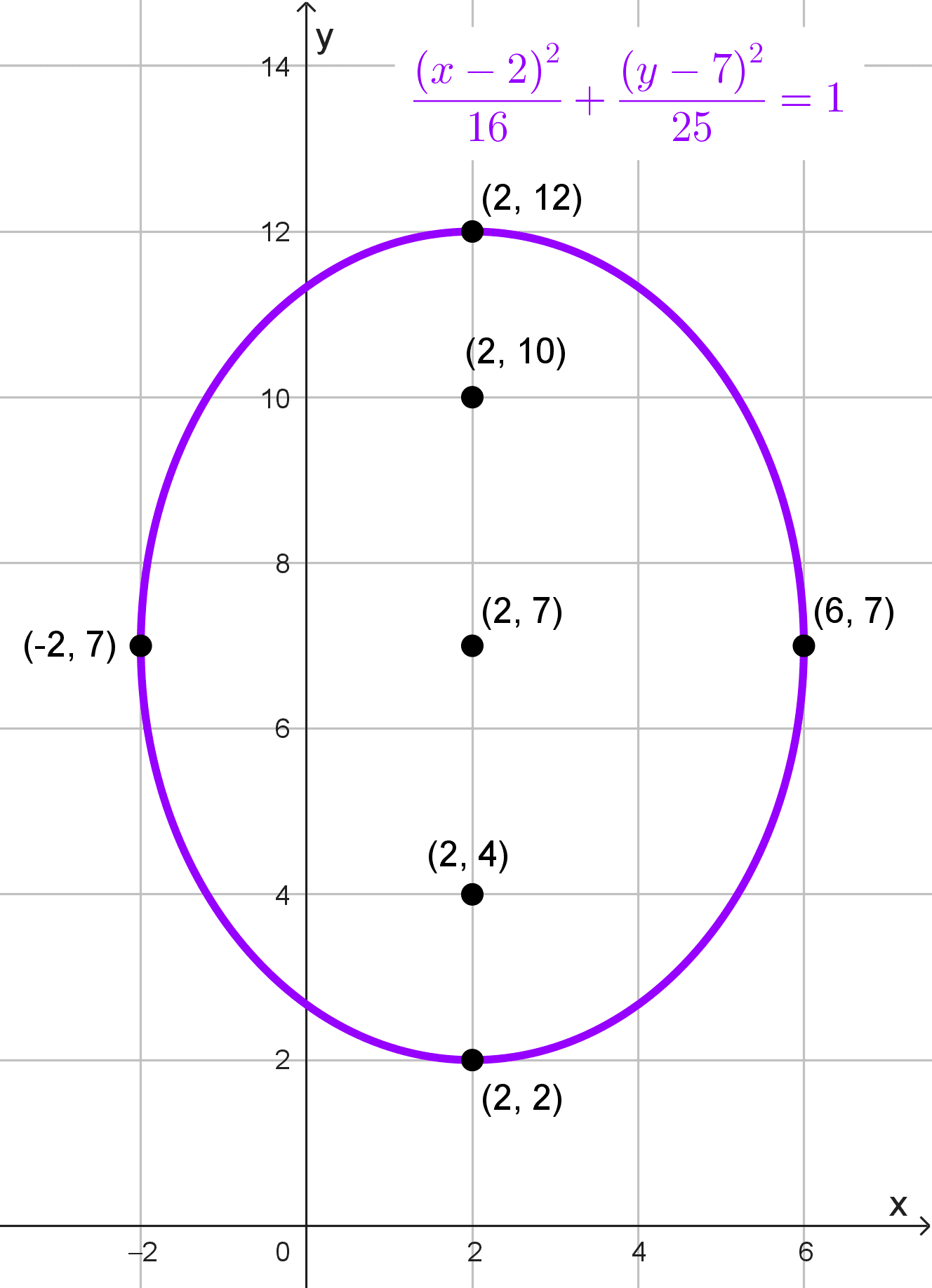 Identificamos la orientación de la elipse. Como los focos están alineados verticalmente (x = 2 es constante), la elipse es vertical. Su ecuación es: