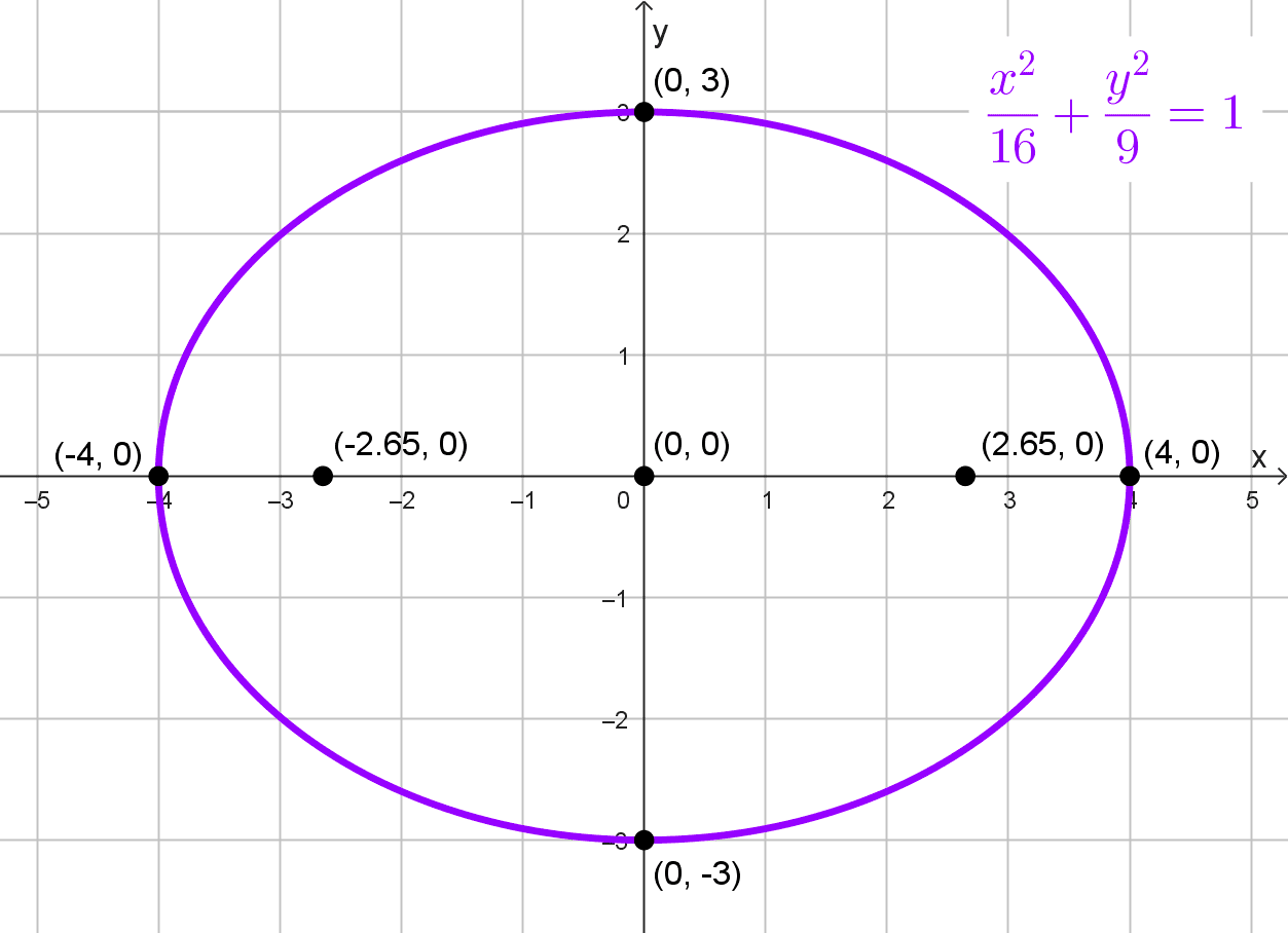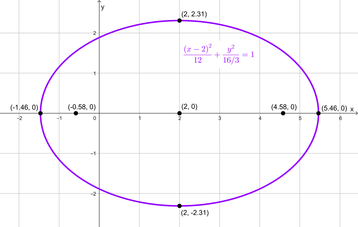 Este es uno de los datos que necesitamos para obtener la ecuación. Ahora hallamos el centro de la elipse como el punto medio entre los focos, en este caso es el origen (0, 0). Los focos se encuentran sobre el eje x, lo que resulta en una elipse horizontal. Es decir, la ecuación tendrá la siguiente forma: