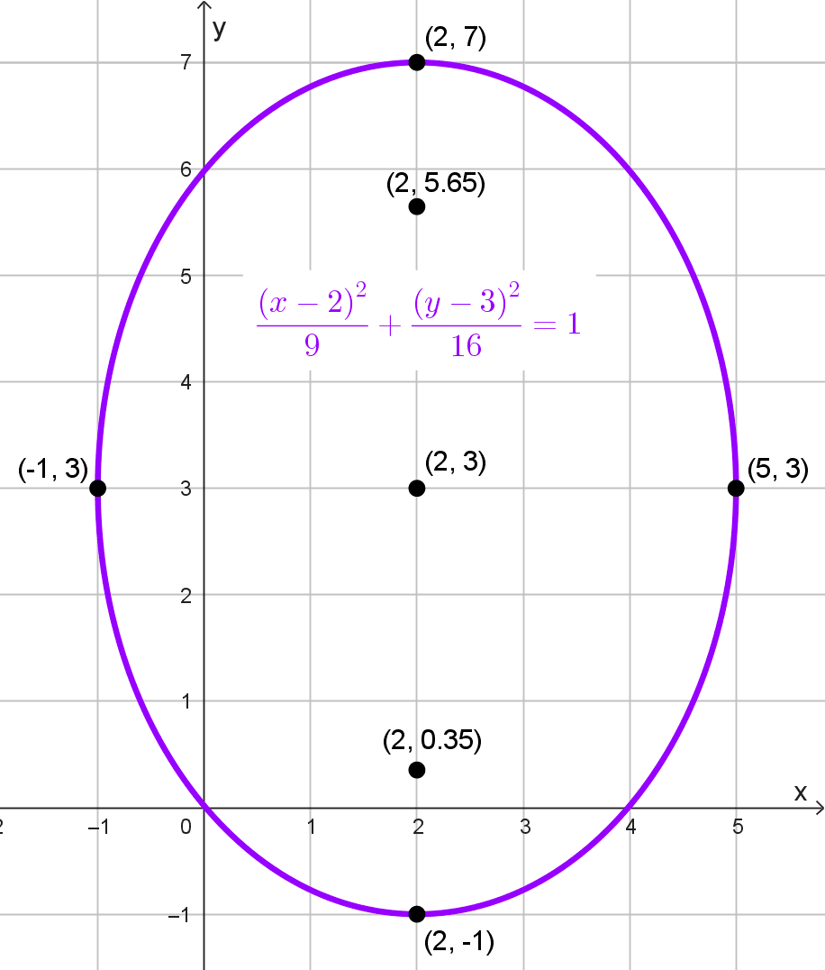 Hallar la ecuación de la elipse con focos en (2, 3) y (2, 7) y pasa por el punto (4, 5).