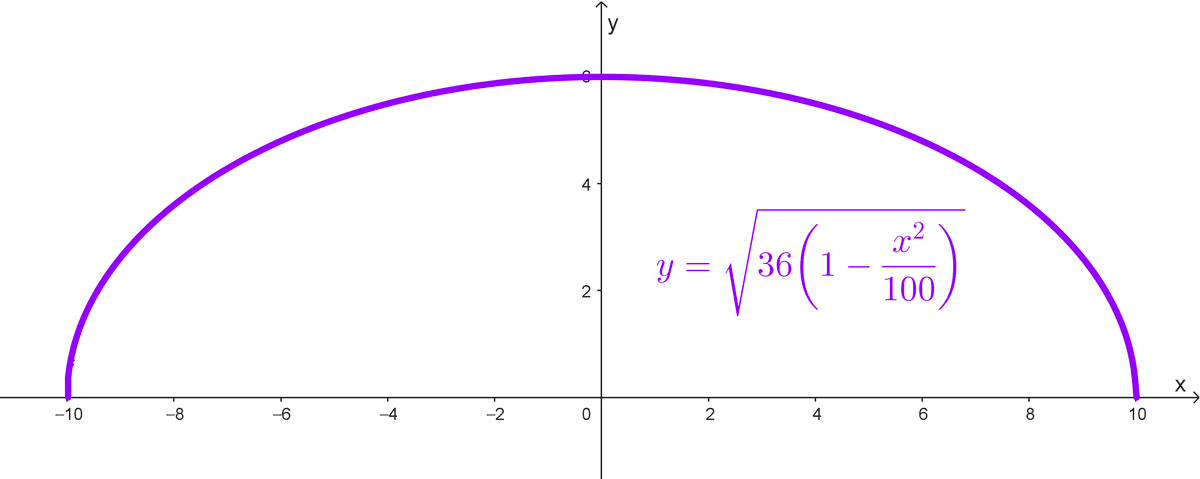 - Ecuación de la puerta del teatro (semielipse): \(y=\sqrt{36 \left(1-\dfrac{x^2}{100}\right)}\)