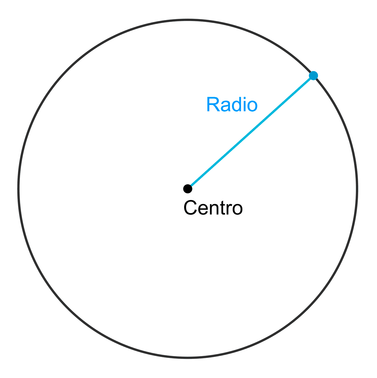 El radio es un segmento de recta que une el centro de la circunferencia con cualquier punto perteneciente a ella. Si el centro de la circunferencia es C(h, k) y un punto sobre ella es P(x, y), la longitud del radio r se calcula mediante la fórmula de la distancia: