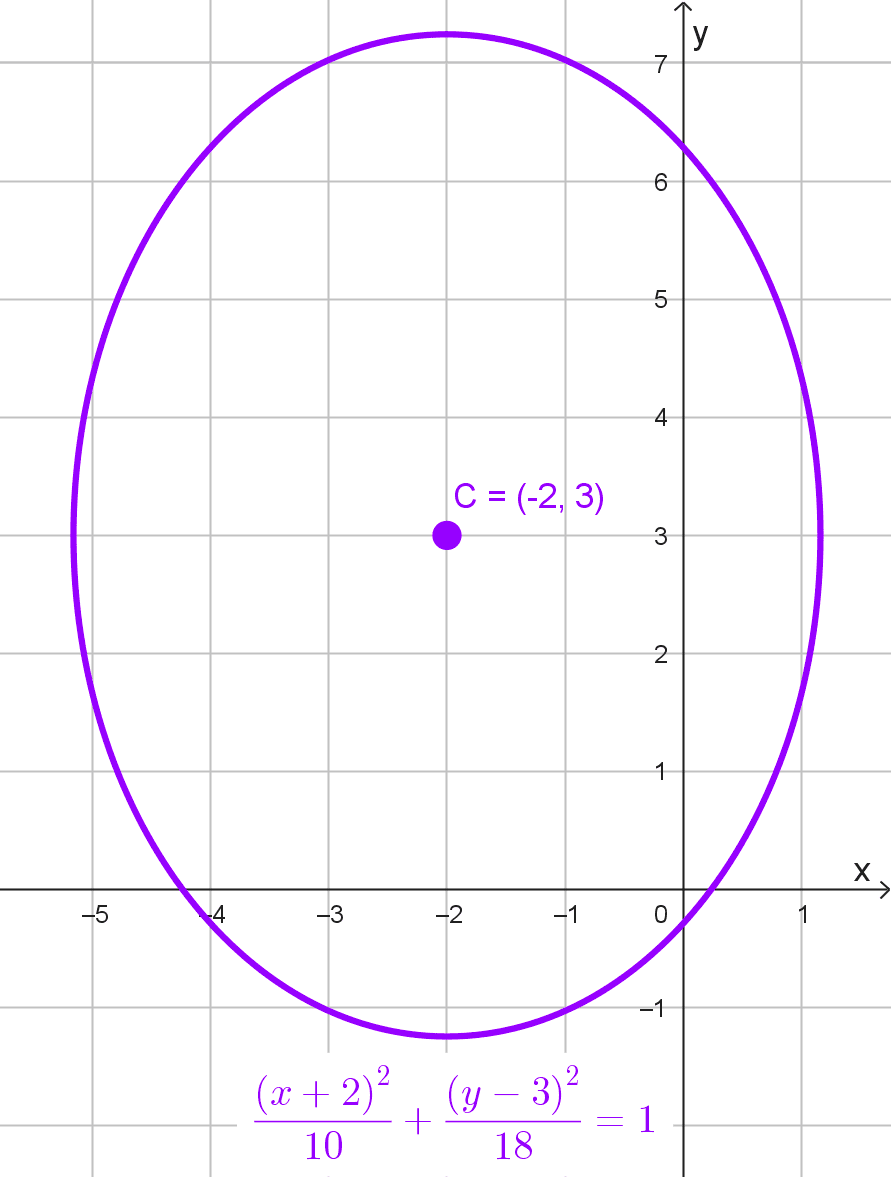 Así, la elipse es horizontal, con centro en *(-3, 4),* semieje mayor *a=6* y semieje menor *b=4.*