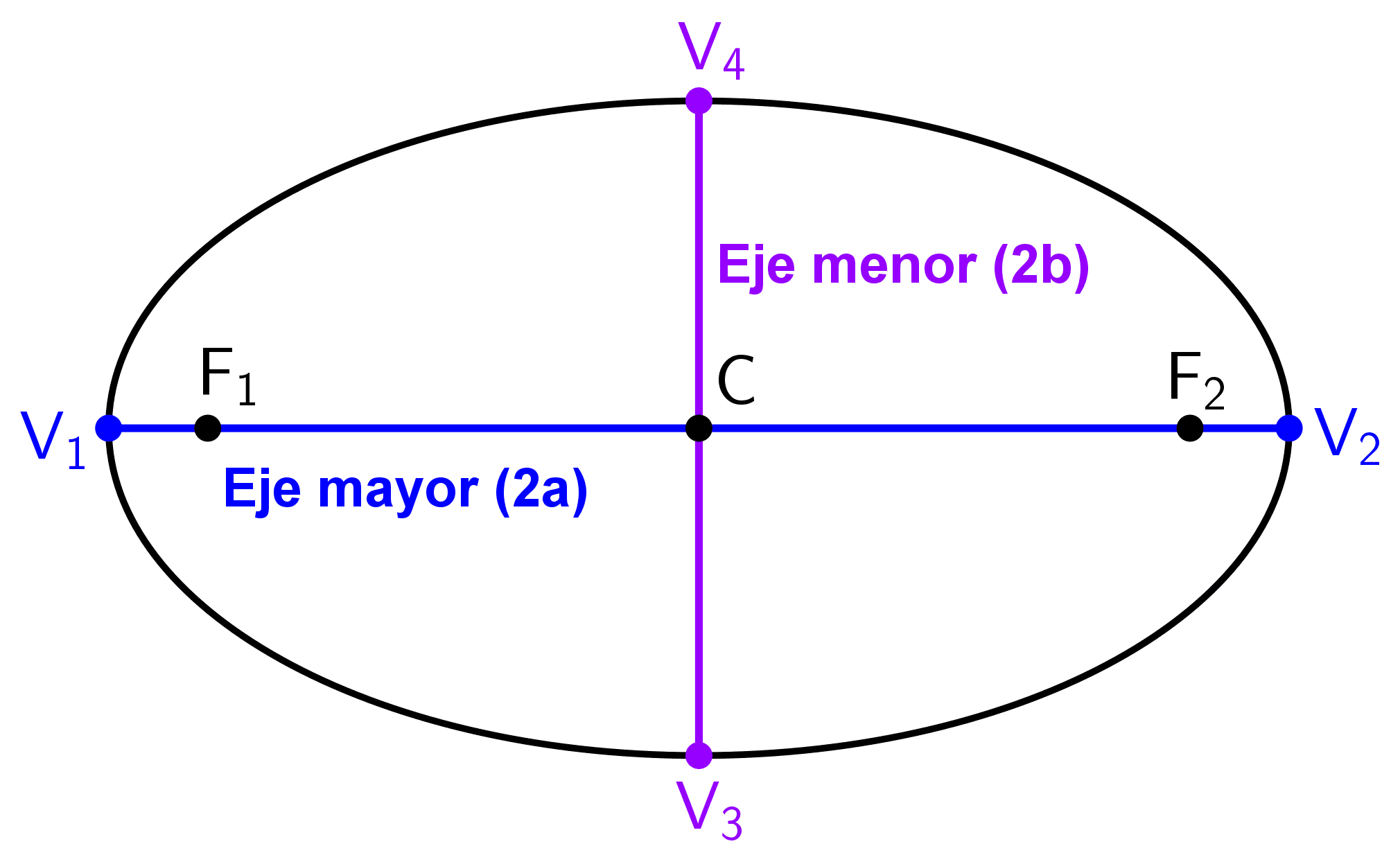 Donde a es la distancia desde el centro de la elipse hasta el vértice, y c es la distancia desde el centro hasta uno de los focos. Entonces, la suma de las distancias desde V2 hasta los focos es: