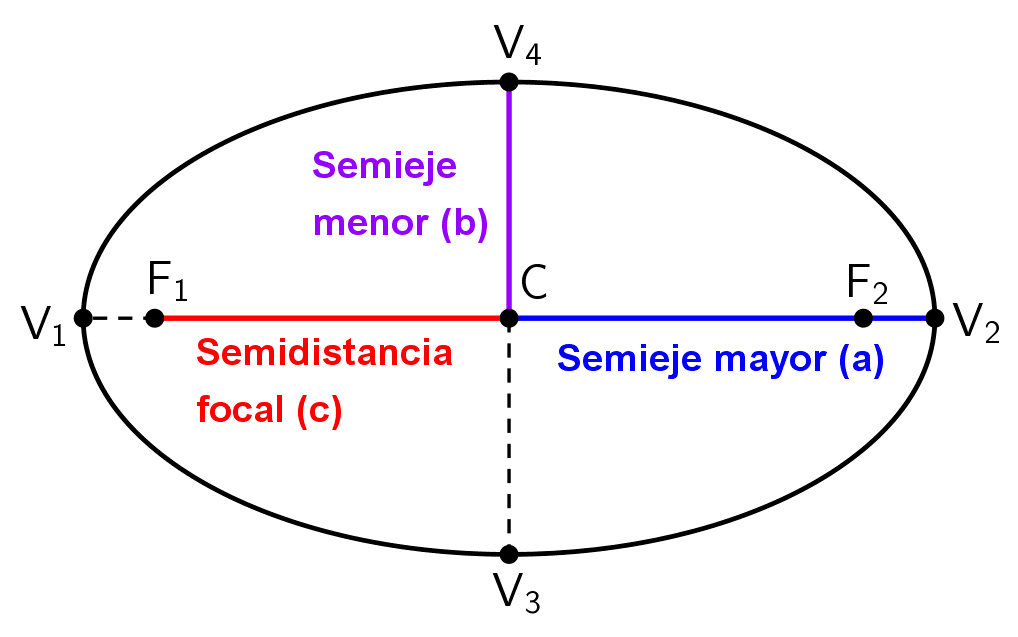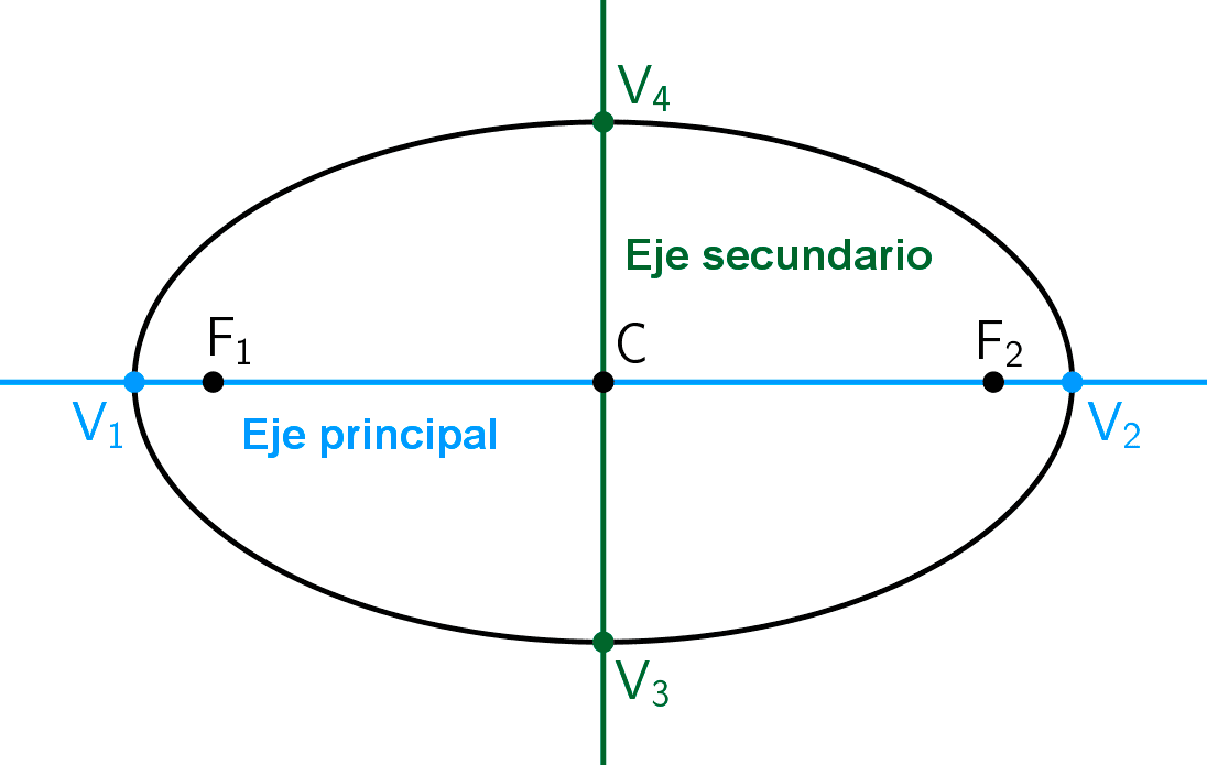 - Vértices: son los cuatro puntos de intersección de la elipse con sus ejes. Se representan con las letras V1, V2, V3 y V4. Los que están sobre el eje mayor se llaman vértices principales y los que están sobre el menor se llaman vértices secundarios o covértices.