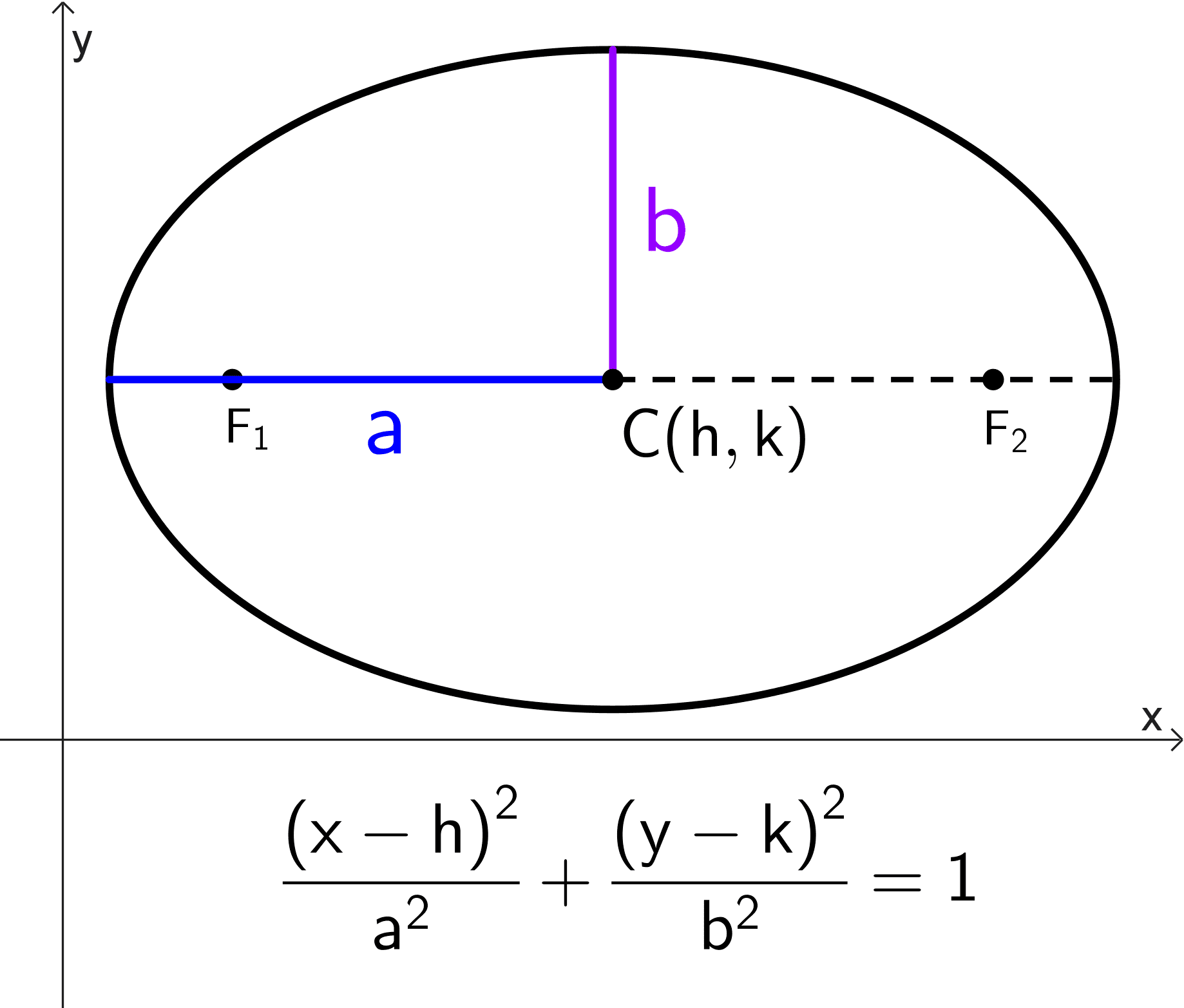 Elipse con eje mayor horizontal: *\dfrac{(x-h)^2}{a^2}+\dfrac{(y-k)^2}{b^2}=1*