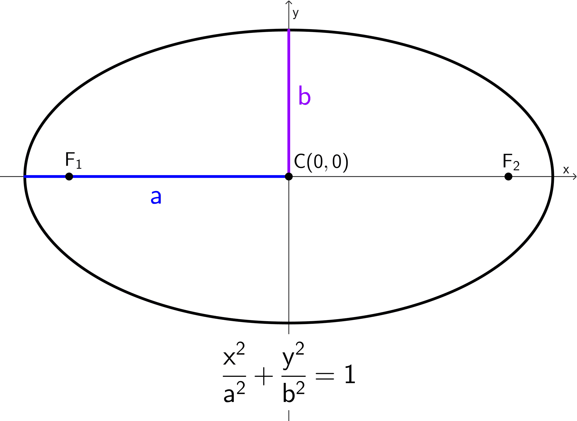 Esta última es la ecuación canónica de la elipse con centro en (0, 0), focos en (-c, 0) y (c, 0), eje mayor sobre el eje x y vértices en (-a, 0) y (a, 0). La longitud del semieje mayor es a y la del eje menor es b.