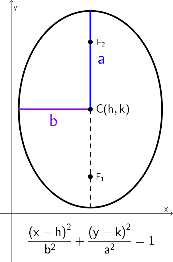 - Elipse vertical (eje mayor paralelo al eje Y): *\dfrac{(x-h)^2}{b^2}+\dfrac{(y-k)^2}{a^2}=1*