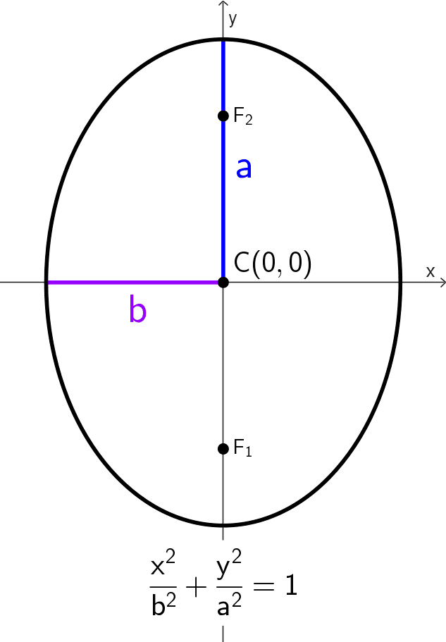 - Elipse vertical (eje mayor sobre el eje Y: *\dfrac{x^2}{b^2}+\dfrac{y^2}{a^2}=1*
