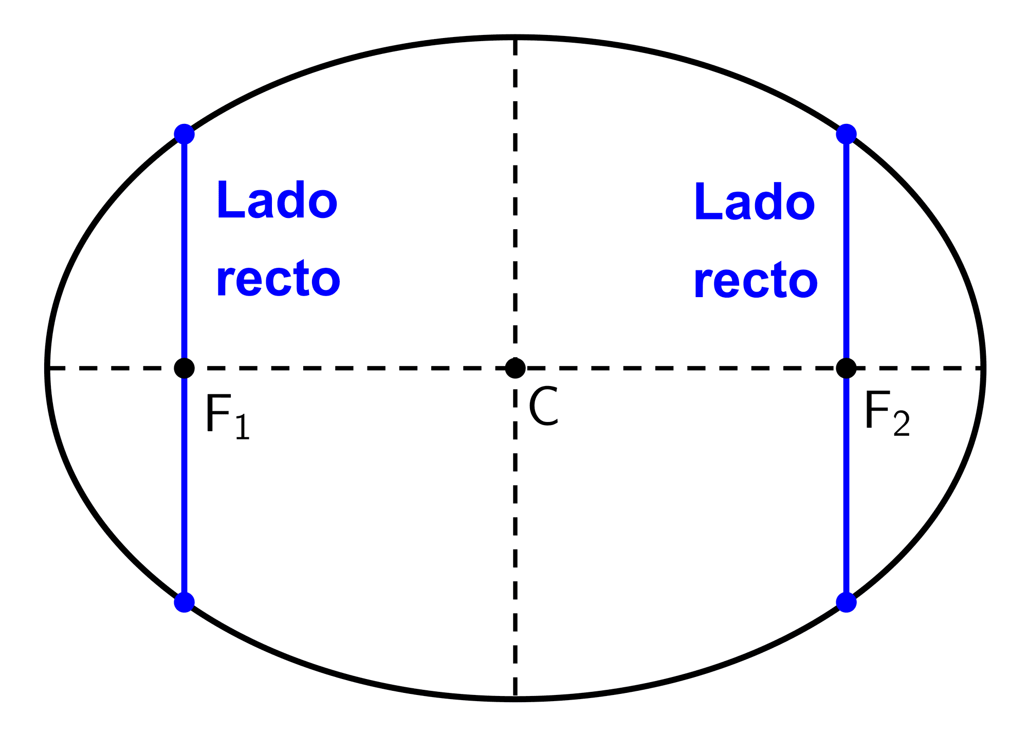- Lado recto: es un segmento que une dos puntos de la elipse, es perpendicular al eje mayor y pasa por uno de los focos. Toda elipse tiene dos lados rectos cuyas longitudes son LR = 2b2 / a.