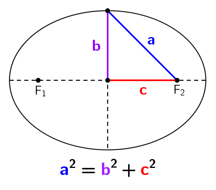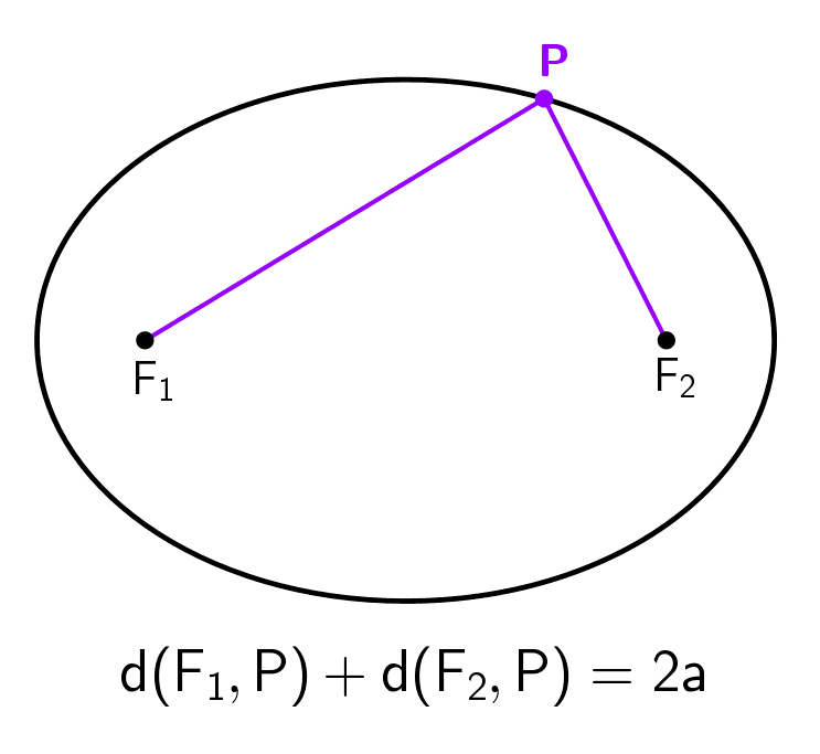 - Focos (F1 y F2): son dos puntos fijos del plano. La característica fundamental de una elipse es que la suma de las distancias desde cualquier punto de la elipse a estos dos focos es constante.