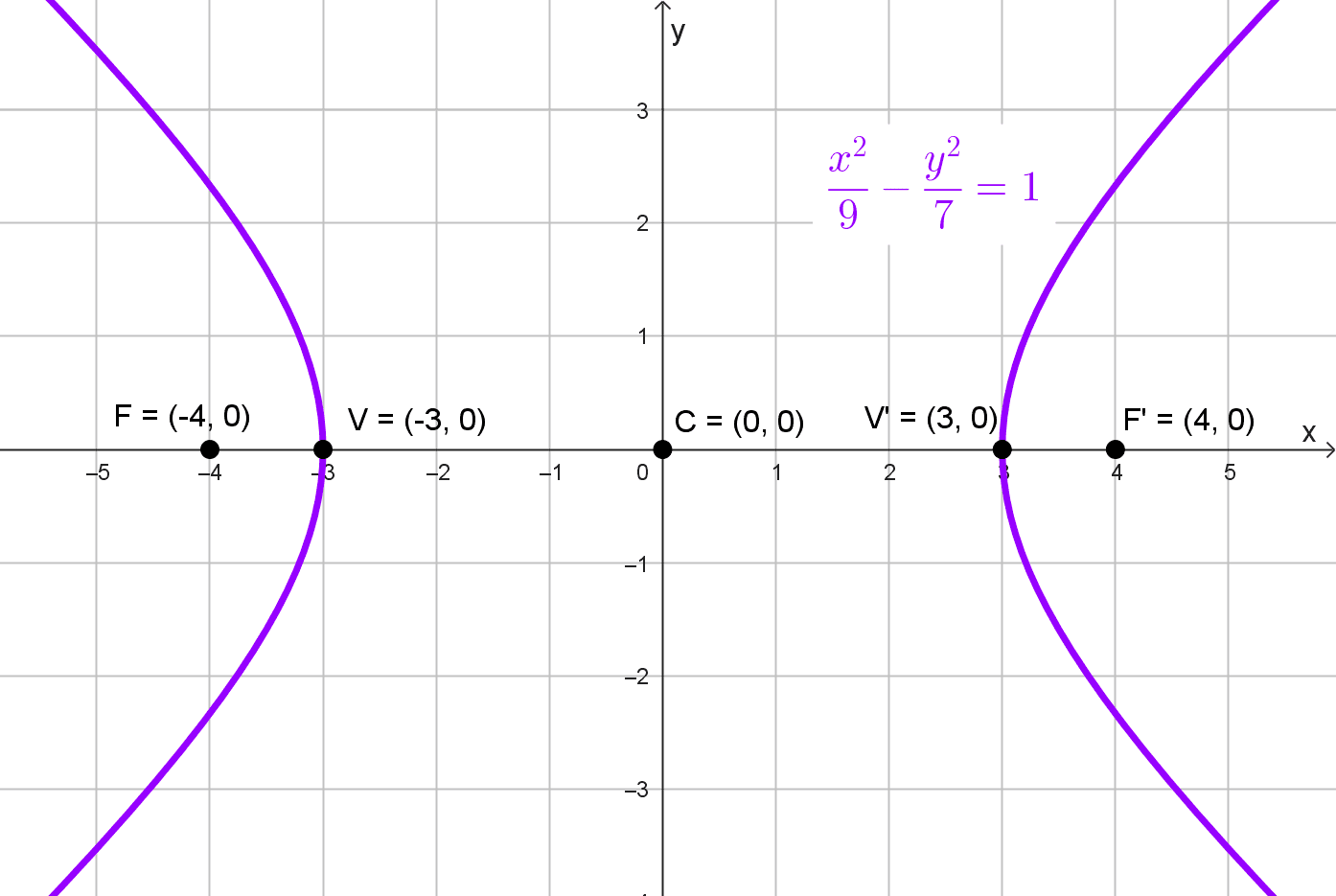 Los vértices están a una distancia a = 3 del centro. Por otro lado, la distancia entre el centro y los focos es c = 4. La relación entre a, b y c para una hipérbola es: