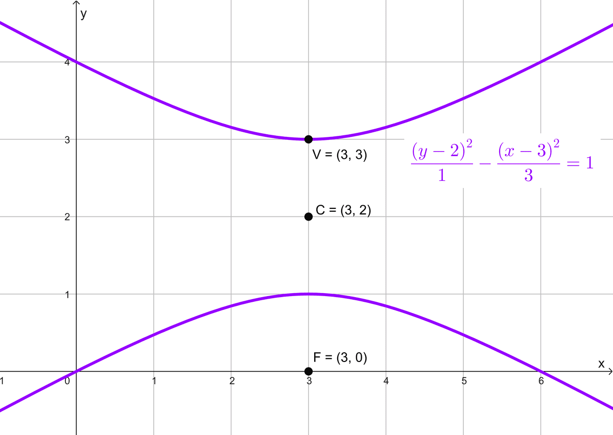 La distancia entre el centro y el vértice es a = 1, de (3, 2) a (3, 3). La distancia entre el centro y el foco es c = 2, de (3, 2) a (3, 0).