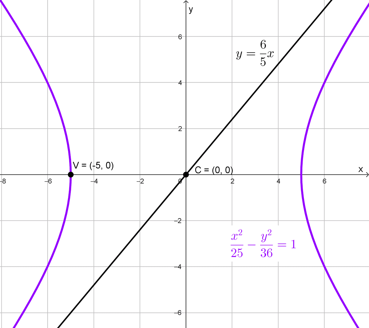 Hallar la fórmula canónica de una hipérbola con centro en el origen, vértice en (-5, 0) y asíntota \(y=\dfrac{6}{5}x.\)