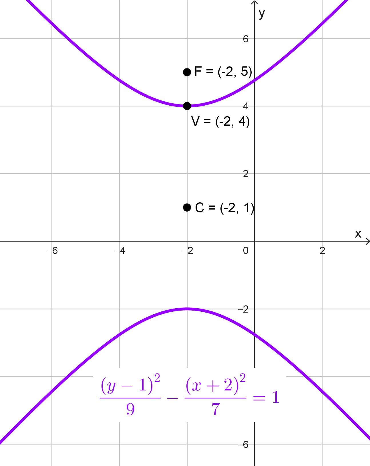La distancia entre el centro y el vértice es a = 3, de (-2, 1) a (-2, 4). La distancia entre el centro y el foco es c = 4, de (-2, 1) a (-2, 5).