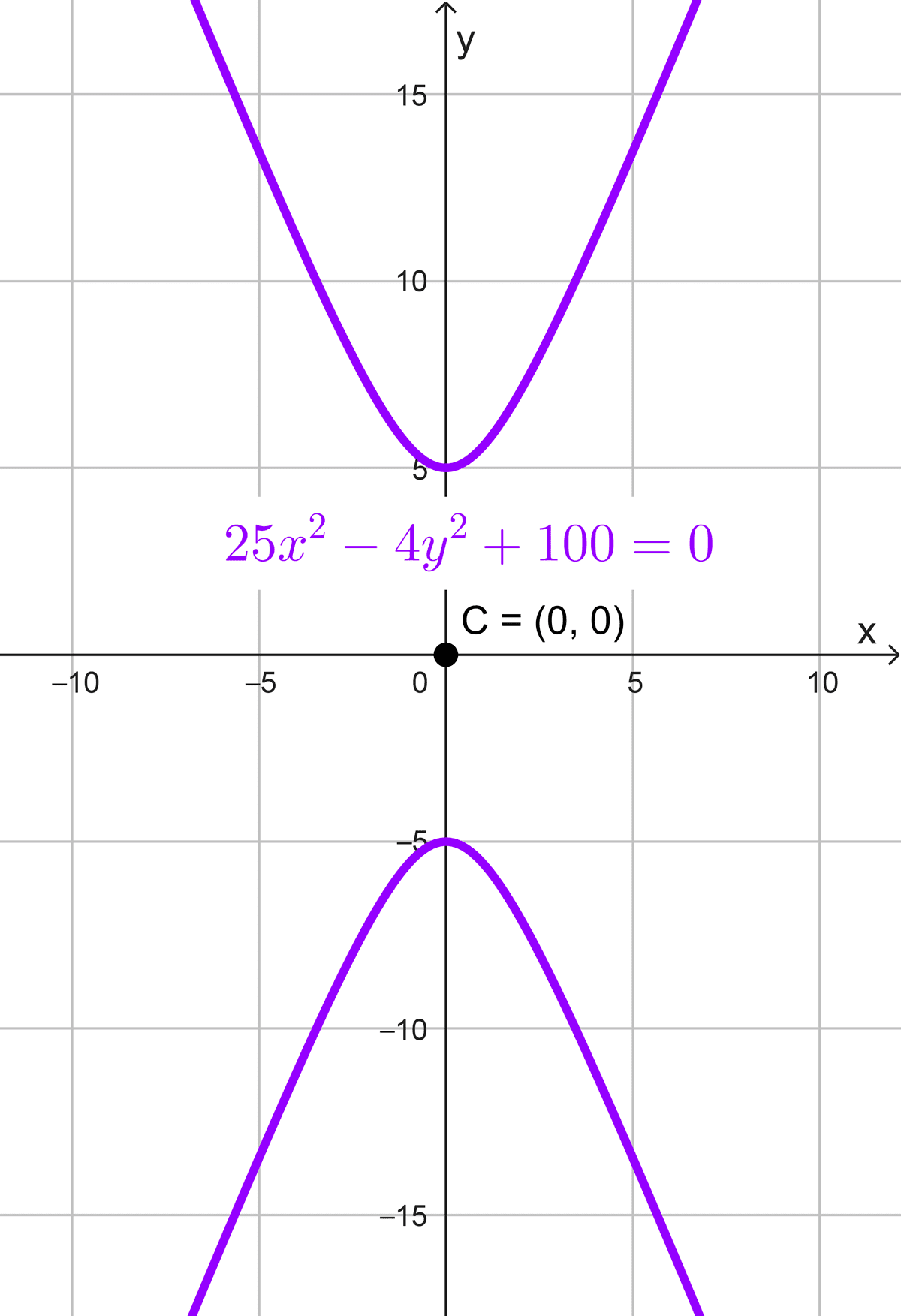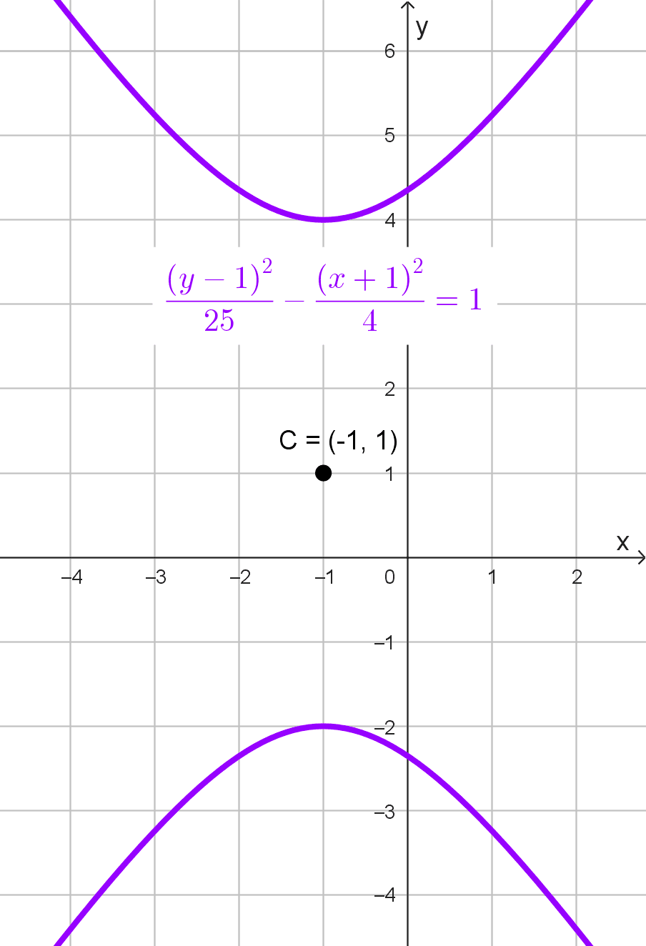 - \(\dfrac{(y-1)^2}{25}-\dfrac{(x+1)^2}{4}=1\) está centrado en (-1, 1).