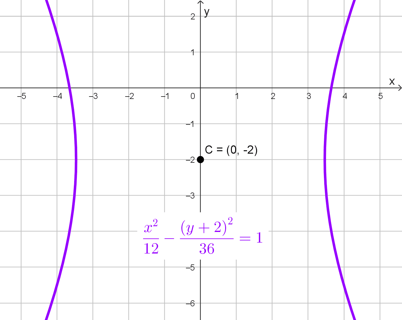 - \(3x^2-y^2-4y-40=0\) completando cuadrados es \(\dfrac{x^2}{12}-\dfrac{(y+2)^2}{36}=1,\) cuyo centro está en (0, -2).