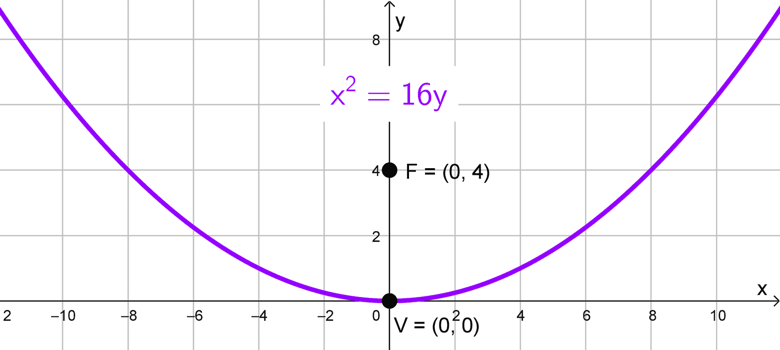 Hallar la ecuación de la parábola con vértice en el origen y foco (0, 4).