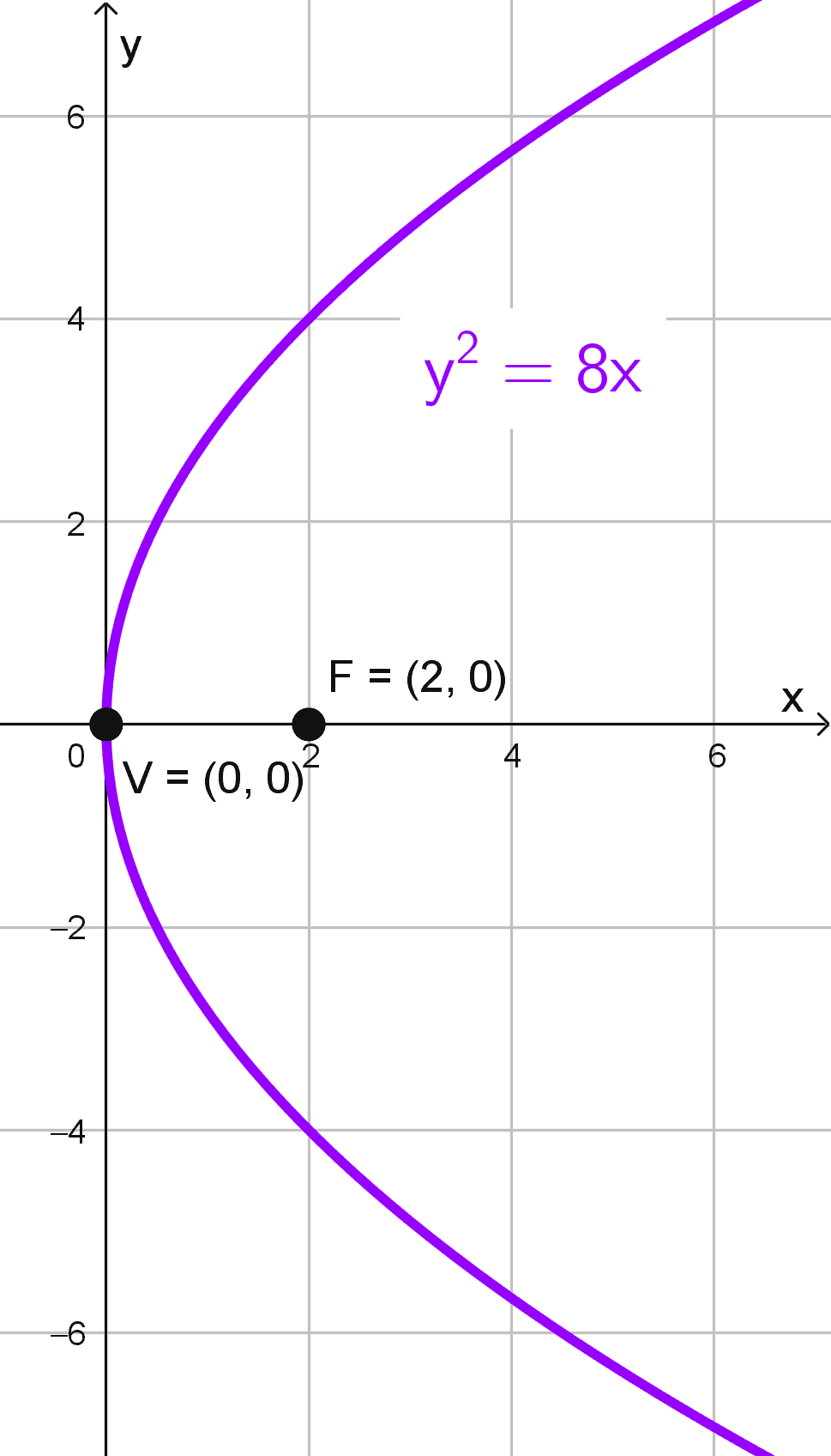 Escribe la ecuación de la parábola con vértice en el origen y foco F(2, 0).