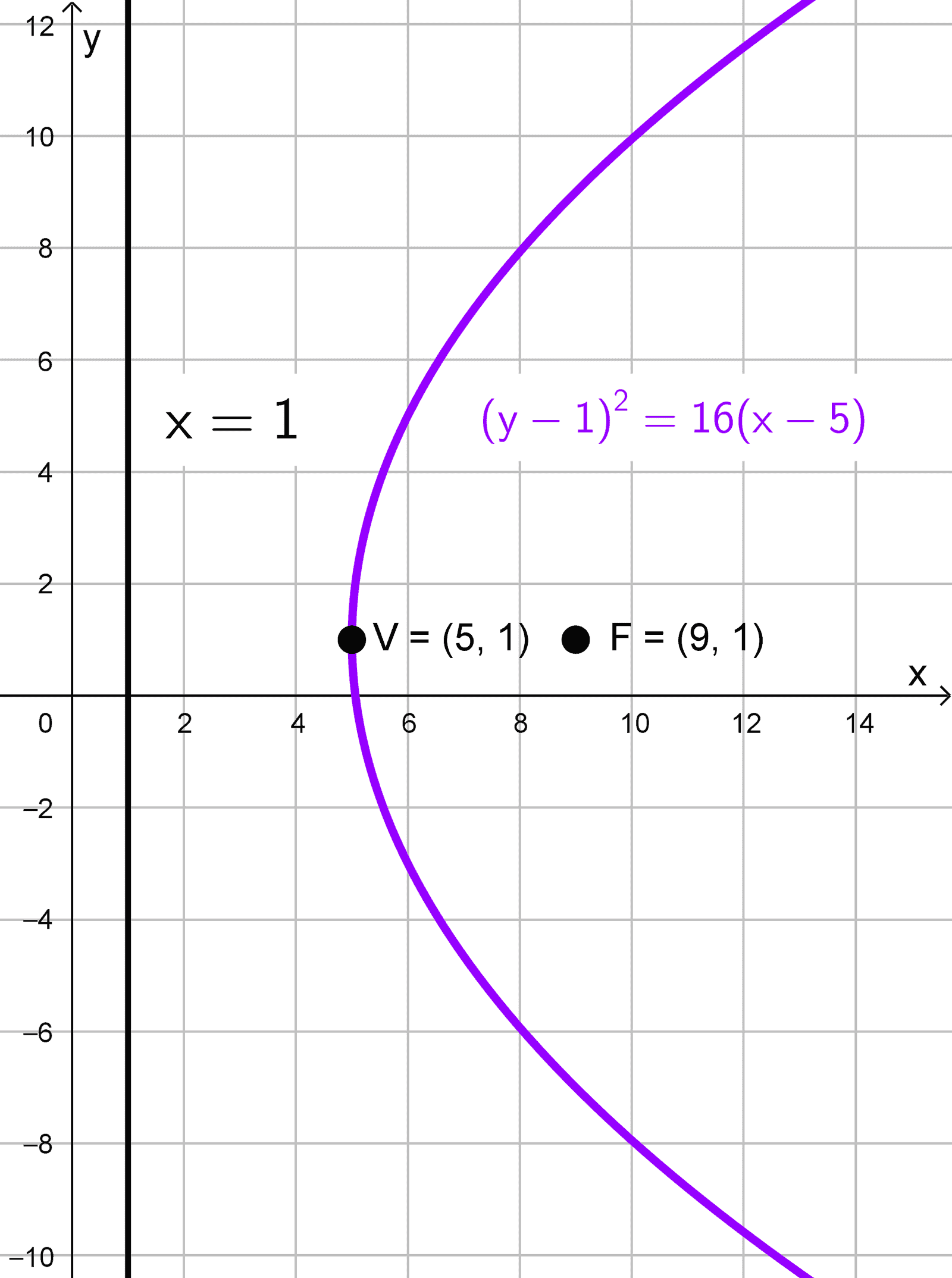 Escribe la ecuación de la parábola con vértice en (5, 1) y directriz x = 1.